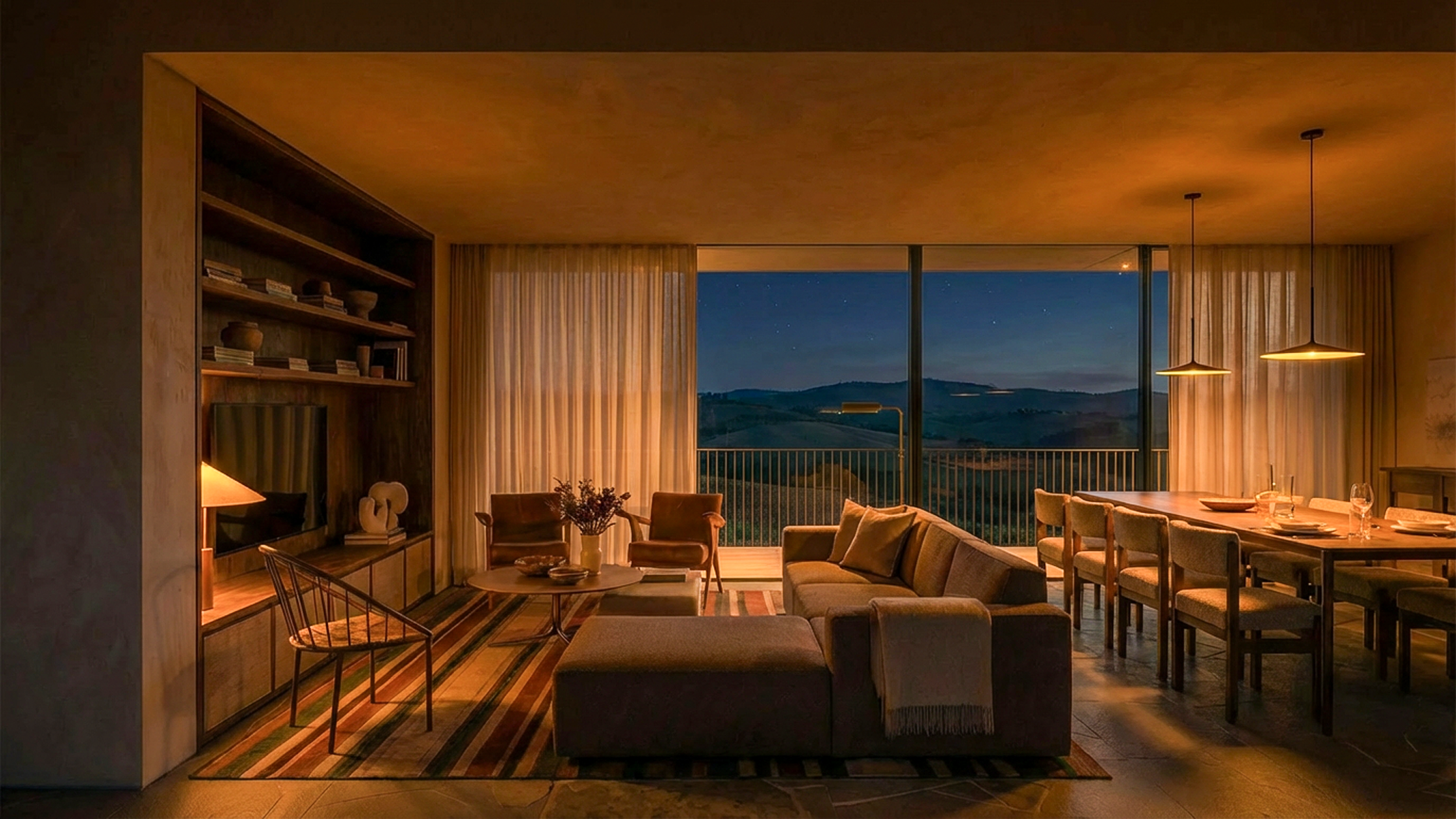 Situada em uma esquina privilegiada, no ponto mais alto do condomínio, a residência se abre para o horizonte com um gesto singelo: a área social se projeta sobre um jardim de esquina, permitindo a contemplação, sem obstáculos, do espetáculo cotidiano do entardecer em Bauru. Em contraste, as áreas íntimas e de serviço recolhem-se com discrição para um pátio voltado ao nascente, onde o sol da manhã banha suavemente o início de cada dia.