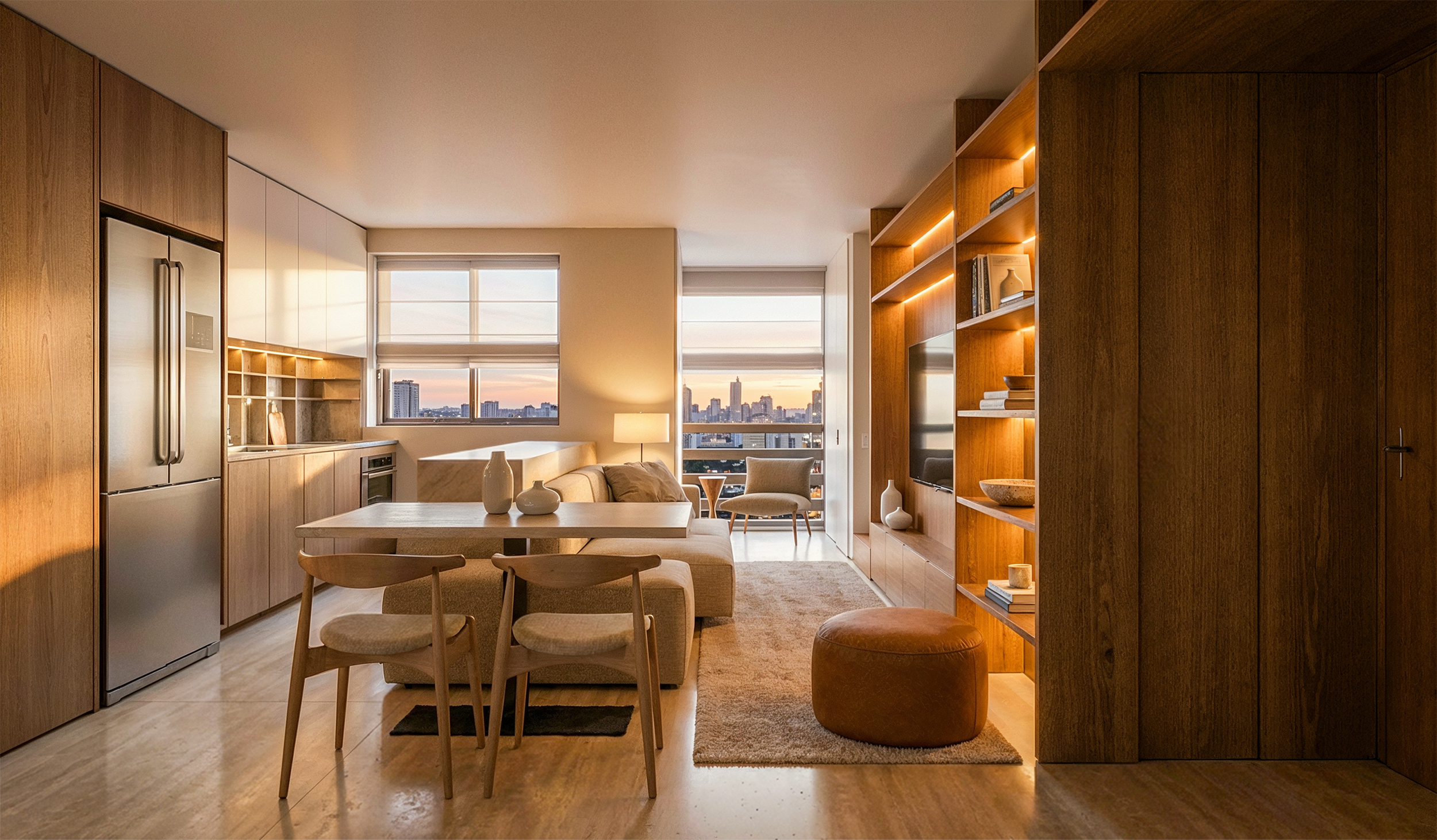 O Apartamento FM é um santuário urbano desenhado para quem busca a harmonia perfeita entre design contemporâneo e o calor dos materiais naturais. O projeto privilegia uma paleta neutra e terrosa, onde os painéis de madeira natural se destacam, revestindo paredes e armários de ponta a ponta para criar uma atmosfera de aconchego e sofisticação contínua. Cada detalhe foi pensado para otimizar o espaço e a funcionalidade, desde a área social integrada que convida à convivência, até a iluminação em LED embutida que realça a arquitetura e proporciona um conforto visual imediato.